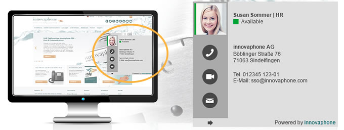 ¿Cómo funciona el “Call Me Button” de innovaphone? La programación del “Call Me Button” innovaphone en una página web se lleva a cabo de forma muy sencilla a través de JavaScripts gratuitos disponibles en el Toolbox myPBX. Es posible integrar el botón de llamada en los laterales de la web para que se despliegue a modo de asistente o directamente en formato tarjeta de visita. Si se desea, se puede mostrar automáticamente la presencia del contacto (disponible, no disponible). Para la transmisión de los datos se utiliza la tecnología WebRTC (Web Real Time Communication), soportada por muchos navegadores. MyPBX Toolbox ofrece múltiples códigos de muestra que permiten la integración de esta funcionalidad en cualquier página web.