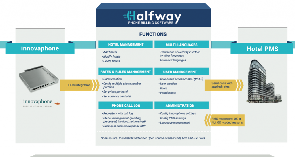 Halfway es el tarificador telefónico especialmente diseñado para el sector hotelero, que se integra de forma nativa con su central PBX de telefonía , así como con múltiples sistemas PMS del mercado. Disponga de la gestión de tarificación de toda su cadena de hoteles, en una única aplicación.