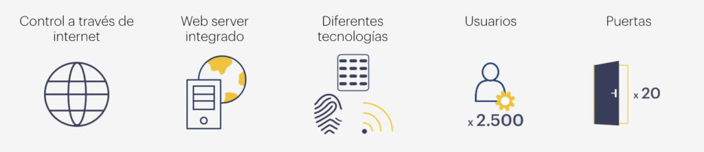 El sistema WS4 puede administrar hasta 20 puertas y 2500 usuarios. Gracias a su servidor web integrado, no se necesita un ordenador dedicado a su gestión y es accesible desde cualquier sitio.